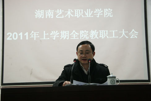 鲁雁飞院长围绕抓好招生就业、重点项目的申报、成立演艺职教集团、建党90周年的庆祝活动、校庆六十周年的筹备和新校区搬迁扩建等6项重点工作及搞好教学、加强科研、抓好学生管理和校园安全保卫、做好后勤服务、抓好艺术培训和文化产业、抓好党建和群团等日常工作方面对学院今年的发展规划进行了详细阐述。
