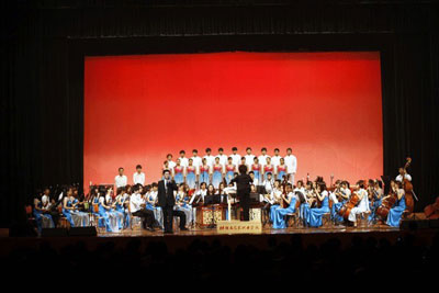 音乐会在合奏《龙腾虎跃》中拉开帷幕。期间,乐团的成员们先后演奏了《乡韵》、《葡萄熟了》、《西部民歌串烧》等乐曲,优美旋律赢得了师生们的阵阵掌声。