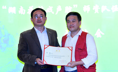 本次会议的主题是“湖南花鼓戏声腔表演的历史传承与发展”。易介南书记、鲁雁飞院长分别致欢迎词,并代表学院为受邀的9位专家颁发了客座教授聘书,为学院“国家精品资源共享(开放课程)”成员颁发了团队骨干聘书。