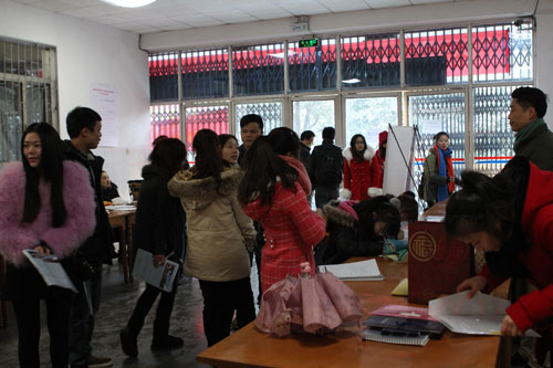 大雪纷飞,普绽琼花鲜丽。上午9点起,同学们踏着积雪陆续来到招聘会现场,投递个人简历,与用人单位进行面对面交流。到会的单位也积极和同学们进行沟通,场面非常热烈。