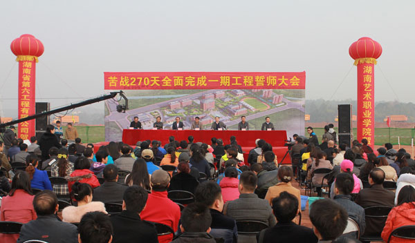 12月8日上午,在美丽的松雅湖畔新校址现场,学院“苦战270天全面完成新校区一期主体工程”誓师大会顺利召开。省文化厅常务副厅长杨福杰同志,学院党委书记鲁雁飞同志、院长沈继安同志,省建工集团六公司董事长陈光乐同志,长沙县经开区管委会副主任范遵新同志,湖南财信房地产公司董事长李春芳同志、总经理成新航同志,湖南财信文化产业投资有限公司常务副总经理钟碧霞同志等出席大会。学院领导余会春同志、周文清同志、杨向东同志、刘家海同志、彭爱莲同志及全院中层干部、离退休老同志和各系部处室代表参加了大会。会议由沈继安同志主持。