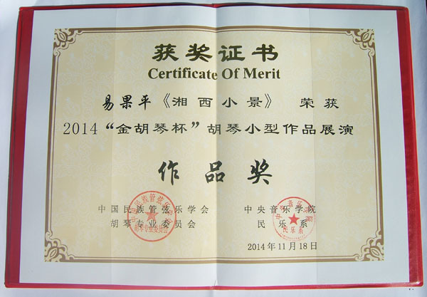 2014“金胡琴杯”胡琴小型作品展演决赛于2014年11月18日在中央音乐学院音乐厅降下帷幕,我院音乐系一级作曲易果平老师创作的二胡独奏曲《看戏》、《湘西小景》、《根籁》分获优秀作品奖、作品奖。此次赛事规格高、专业性强、影响大,由中国民族管弦乐学会胡琴专业委员会、中央音乐学院民乐系主办。