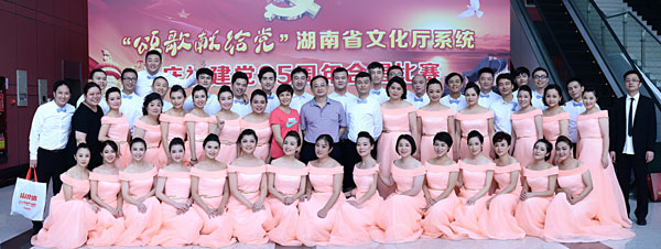 6月26日下午,由省文化厅直属机关党委主办,省文化馆承办,九天星(湖南)文化传播有限公司、长沙大红陶瓷发展有限责任公司协办的“颂歌献给党”湖南省文化厅系统庆祝建党95周年合唱比赛在湖南音乐厅举行。省文化厅党组书记、厅长李晖出席活动并宣布比赛启幕。省委宣传部副部长、省文明办主任刘进能,省直工委委员余卫星,省文化厅副厅长鄢福初,厅党组成员、副厅长肖凌之,厅党组成员、纪检组长廖星,厅党组成员、副厅长张帆,厅巡视员孟庆善,厅副巡视员何强和各厅直单位主要负责人以及760多名参赛队员参加活动。