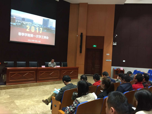 4月13日,学院2017年春季学期第一次学工例会在松雅校区文化楼101学术报告厅召开,学院副院长余会春出席会议并讲话,学工保卫党支部、系党支部及相关处室负责人,学生干事、辅导员(班主任)及全体学工人员参加了会议。会议由学工处处长曹志超主持。