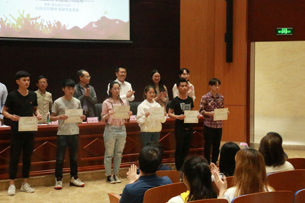 会议在庄严雄壮的国歌声中拉开帷幕。院团委书记邹煜向大会汇报了2016—2017学年度学院共青团工作。院团委副书记雷姣带领171名新团员向团旗庄严宣誓。刘家海同志宣读了“关于省直团工委开展创新创业创优活动和五型团组织标准化创建结果”的通报。余会春同志宣读了2016—2017学年度五四表彰决定,表彰了本学年度在学院团学工作中涌现出来的34个先进集体和279名优秀个人。在欢快的团歌旋律和阵阵掌声中,与会领导先后为获奖集体和个人先后颁奖。