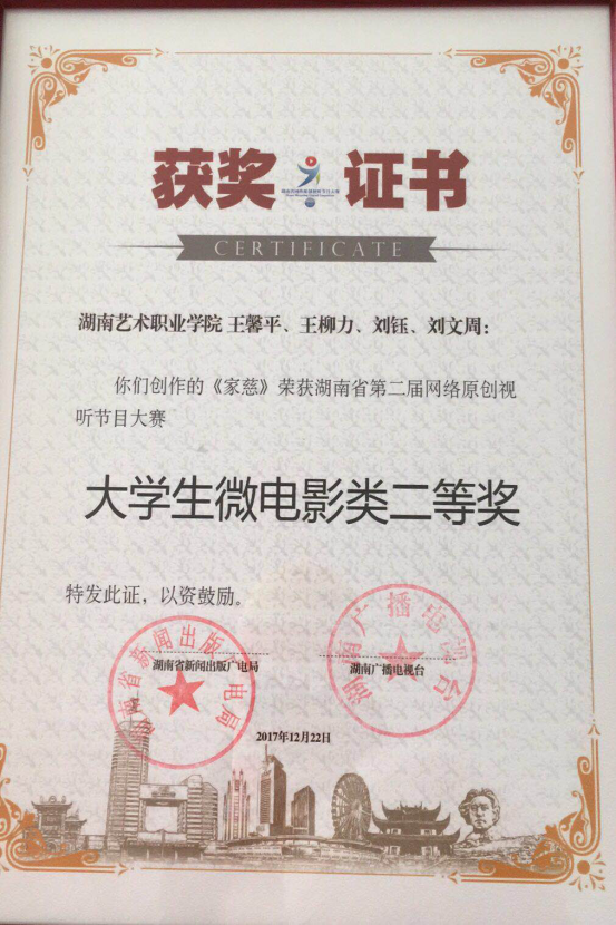 12月22日上午,湖南省第二届网络原创视听节目大赛颁奖仪式在长沙举行。我院影视系师生创作的《蜡染湘西》《在路上》《潭洲里的春柳社》等五部作品获奖,学院获优秀组织奖。院长张勇、副院长杨向东以及影视系负责人、部分获奖师生受邀参加了颁奖仪式,张勇作为颁奖嘉宾为获得“国际传播节目”奖项的两个作品颁奖。