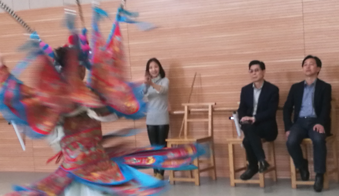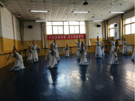 在王艳芳等的陪同下,考察团一行观摩了该院舞蹈精英小班排练课,学生们表演了古典舞基训片段、创编的“桃李杯”获奖群舞节目及舞剧《粉墨春秋》跷功、水袖等经典舞段。表演结束后,王章华应邀做了简短讲话,充分肯定了同学们的表演,勉励同学们珍惜时光,拼搏向上。随后考察团参观了学术报告厅、星光剧院及郭梅花剪纸工作室。