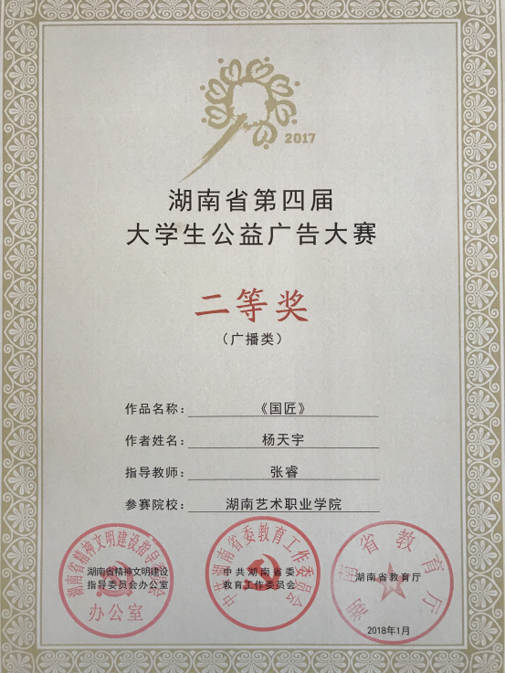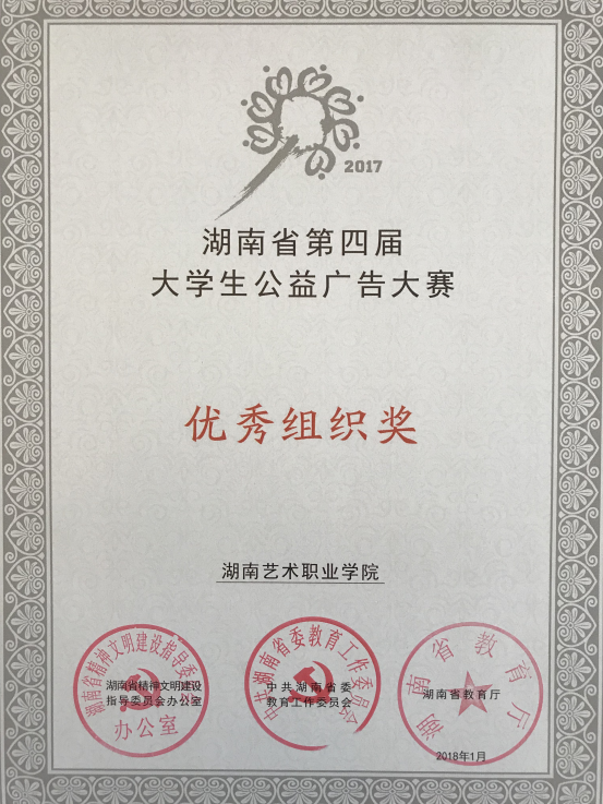 湖南省第四届大学生公益广告大赛由湖南省文明办、湖南省教育工委、湖南省教育厅联合主办,旨在为弘扬社会主义核心价值观,进一步激发当代大学生投身中国特色社会主义公益事业的热情,推进高校校园文化建设。本届大赛以“我骄傲,我是中国人”为主题,面向全省普通高校在校学生征集优秀公益广告作品。据悉,本次大赛经专家评审委员会终评,共评出湖南省第四届大学生公益广告大赛一等奖5个,二等奖20个,三等奖28个;优秀组织奖10个;网络人气奖10个。