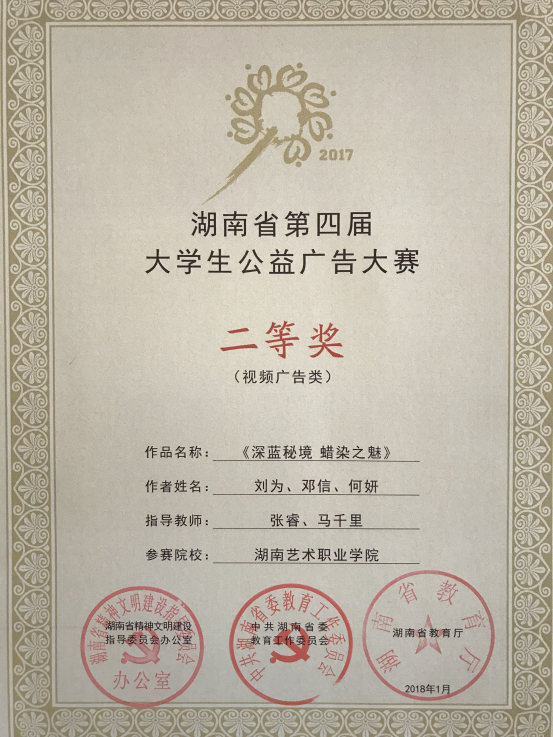 7月7日上午,湖南省第四届大学生公益广告大赛颁奖仪式暨第五届大赛启动仪式在湖南大众传媒职业技术学院图书馆三楼学术报告厅举行。由我院影视系教师张睿指导、杨天宇同学创作的广播公益广告《国匠》;张睿、马千里指导,刘为、邓信、何妍同学创作的视频公益广告《深蓝秘境 蜡染之魅》荣获二等奖。同时,我院也荣获优秀组织奖。