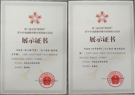 8月20日至24日,由中国文化和旅游部文化科技司主办、中国戏曲学院承办的第三届全国“梨花杯”青少年戏曲教育教学成果展示活动在北京举行。我院戏剧系教师庞焕丽、陈端生,分别指导2017级戏曲表演专业(一年二期)学生付琴思参演湘剧《磨房产子》、2014级戏曲表演专业(四年二期)学生付祖田参演湘剧《水牢摸印》,经过三级评选最终入选个人地方戏少年组展演和个人地方戏青年组展演。
