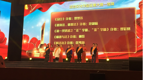 12月4日,湖南省“12·4”国家宪法日暨法治湖南建设年度盛典在省人民会堂隆重举行。我院美术系2016级广告设计与制作专业(中职)范胡杨同学创作的《谁执法,谁普法》在千余份作品中脱颖而出,荣获湖南首届法治文化作品征集大赛一等奖,在典礼中受到了表彰。省委常委、省委政法委书记、省委全面依法治省委员会办公室主任黄关春,省人大常委会副主任周农,省政协副主席贺安杰,省高级人民法院院长田立文,省人民检察院检察长游劝荣等领导出席并观看了此次典礼。