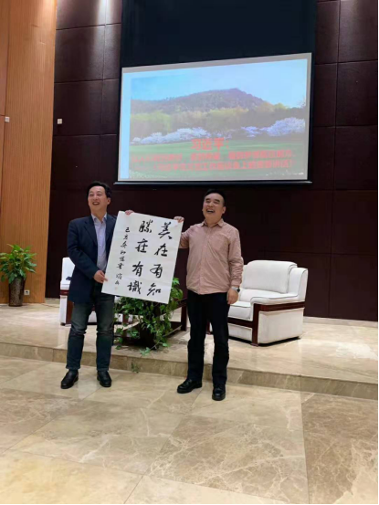 王跃文先生还专门应邀为我院创作了一幅墨宝——学院图书馆馆训“美在有知 胜在有识”。党委书记王章华代表学院接受了王跃文先生的墨宝。