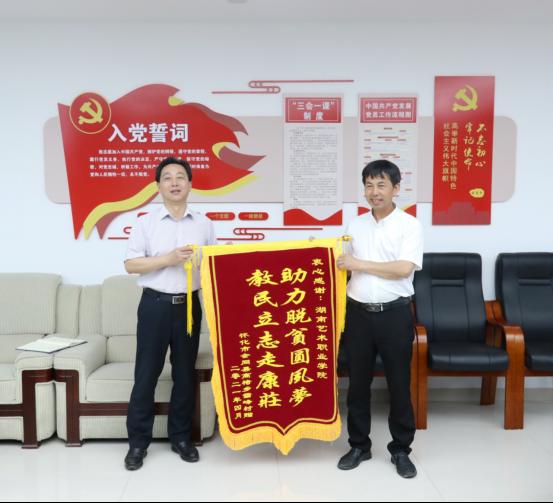 5月13日下午,省文旅厅驻雪峰村工作队队长梁丽平,雪峰村新任村支书、村主任林道华,原村支书伍永发一行专程来我院赠送锦旗并开展座谈。我院党委书记王章华、副院长周文清、副院长刘家海及党政办(宣传统战部)、学工处、工会等相关部门负责人出席会议。