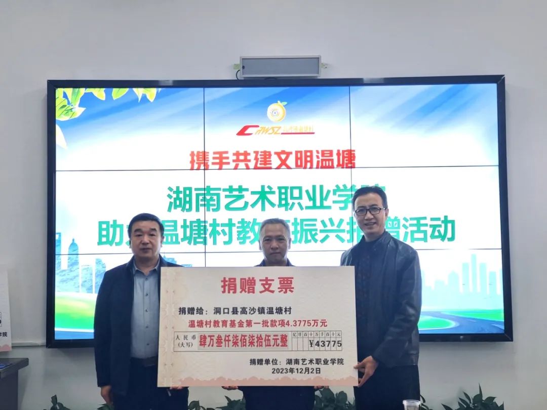 在学校党委行政和全校师生的关心支持下,此次今年会分别向“温塘村同心艺术团”“温塘村教育基金”捐赠价值10万元的舞台灯光、音响、服装和第一批43775元的教育基金款项。