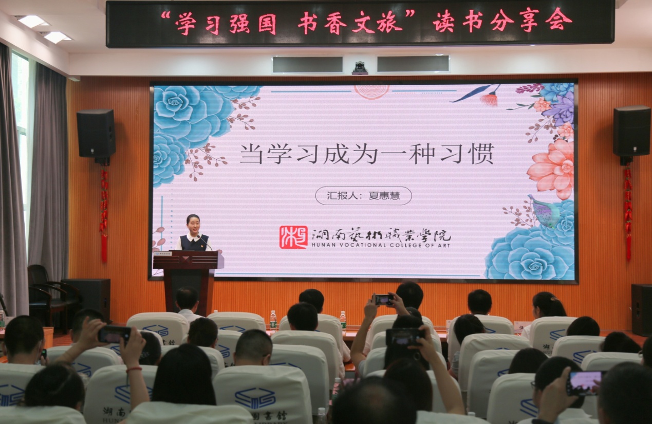 分享会上,来自省文旅厅、jinnianhui今年会、湖南图书馆、湖南省少年儿童图书馆、湖南省文化馆、湖南省博物馆、湖南省湘剧院的9位分享者,围绕“学习强国·书香文旅”主题,结合个人读书、学习体会作了交流发言。我院青年教师夏惠慧结合工作实际,以《当学习成为一种习惯》为题,分享了与学院老师们你追我赶、互学互促,共同学好用好“学习强国”平台,养成自觉学习的好习惯,进一步拓宽学习之路的经历和感想,其幽默流畅的表述展现了学院青年教师良好的精神风貌,获得广泛好评。
