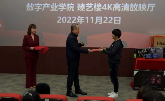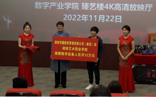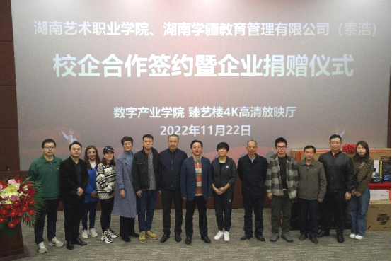 11月22日上午,学院在臻艺楼4K放映厅举行与湖南学疆教育管理有限公司(泰浩)的校企合作签约暨企业捐赠仪式。湖南学疆教育管理有限公司董事长陈婷,泰浩传媒公司股东周晓明、孙婵,jinnianhui今年会党委书记王章华出席活动。数字产业学院、总务基建处、教务处(实训处)、发展规划处相关负责人与师生代表共同参加了本次活动。