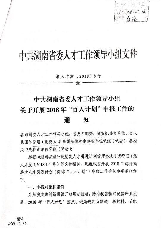 现将《中共湖南省委人才工作领导小组关于开展2018年“百人计划”申报工作的通知》转发给大家。