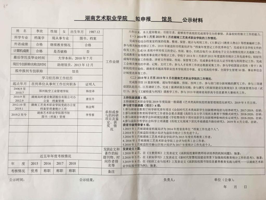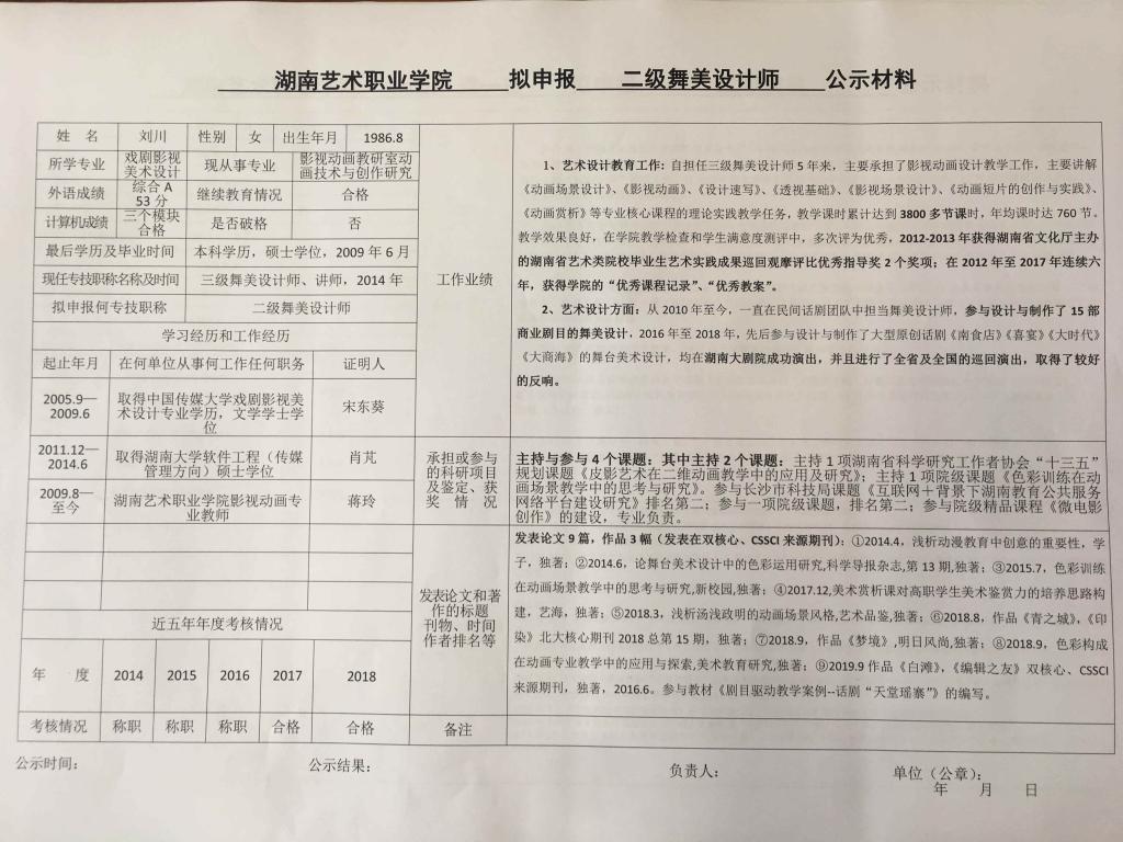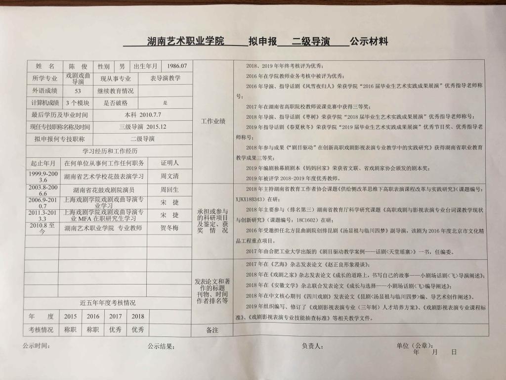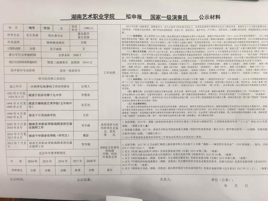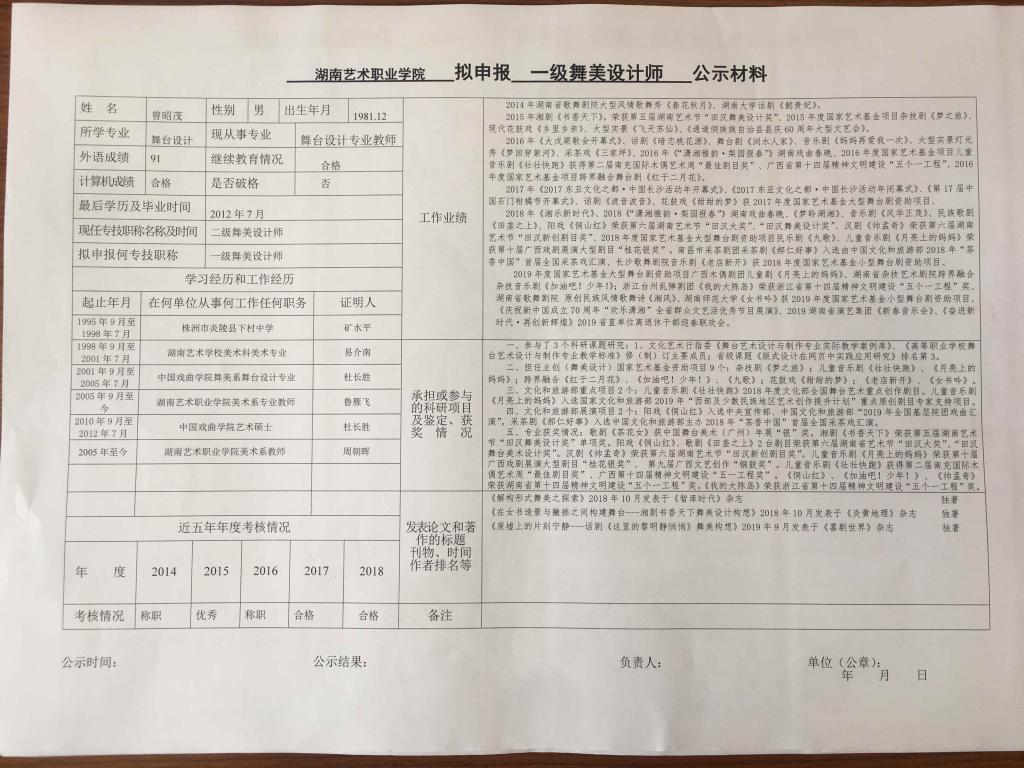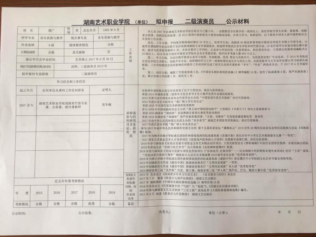 学院今年有34位同志申报艺术、图书资料、群众文化、政工系列职称,按湘文旅人【2019】84号《关于做好2019年度艺术、图书资料、群众文化、文物博物系类职称评审工作的通知》规定,现将以下同志的基本情况予以公示。公示人员名单见附件。
