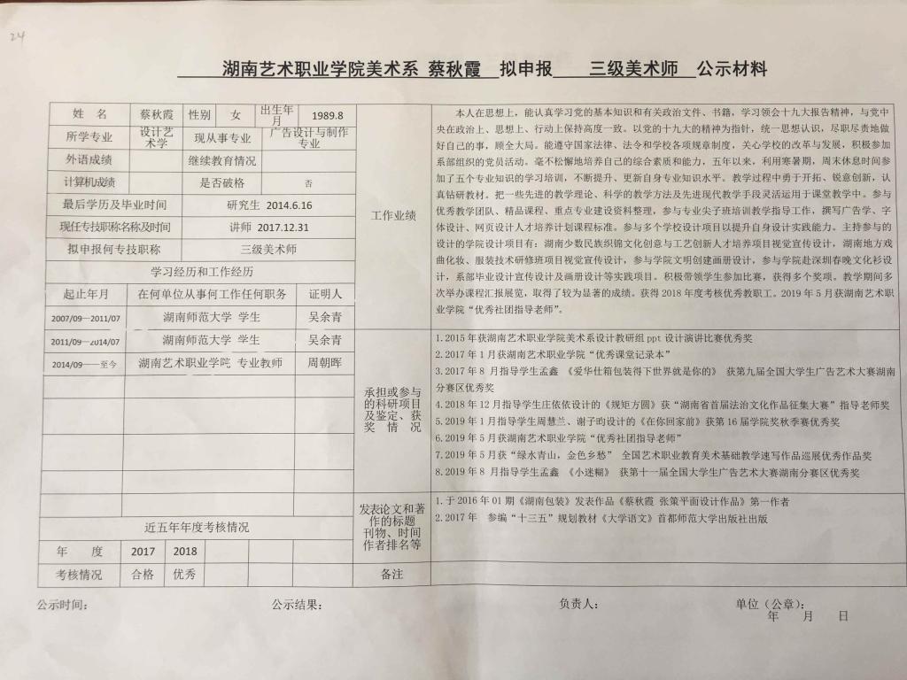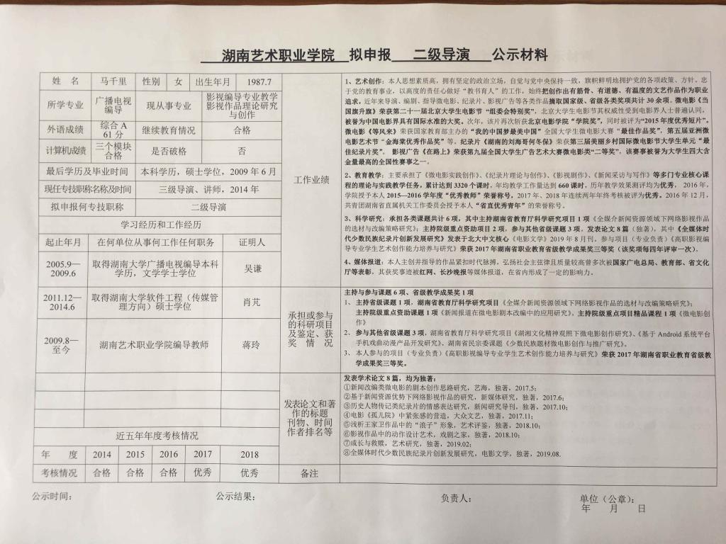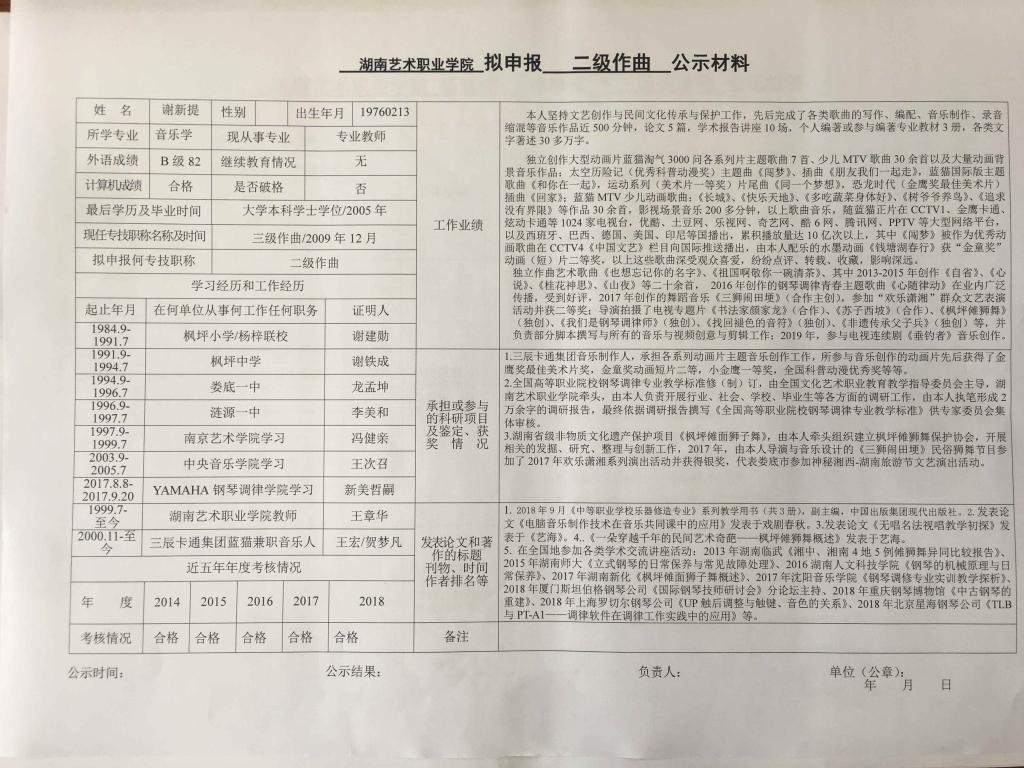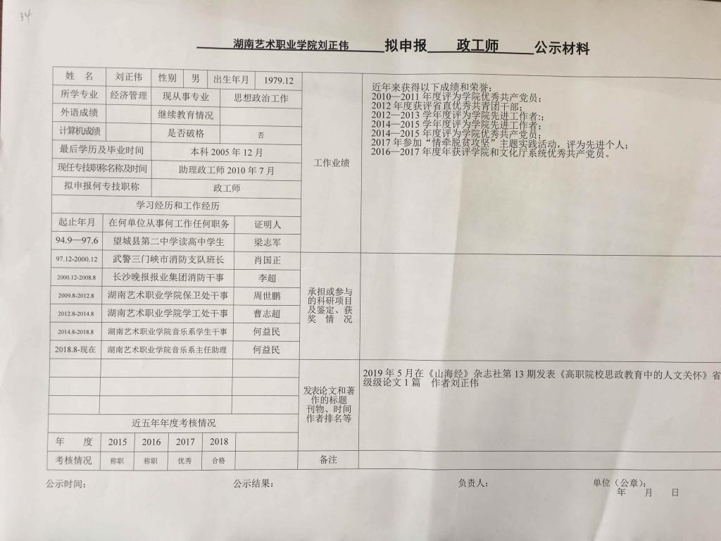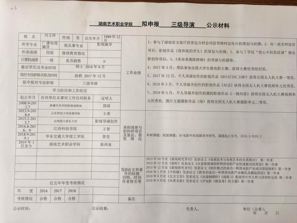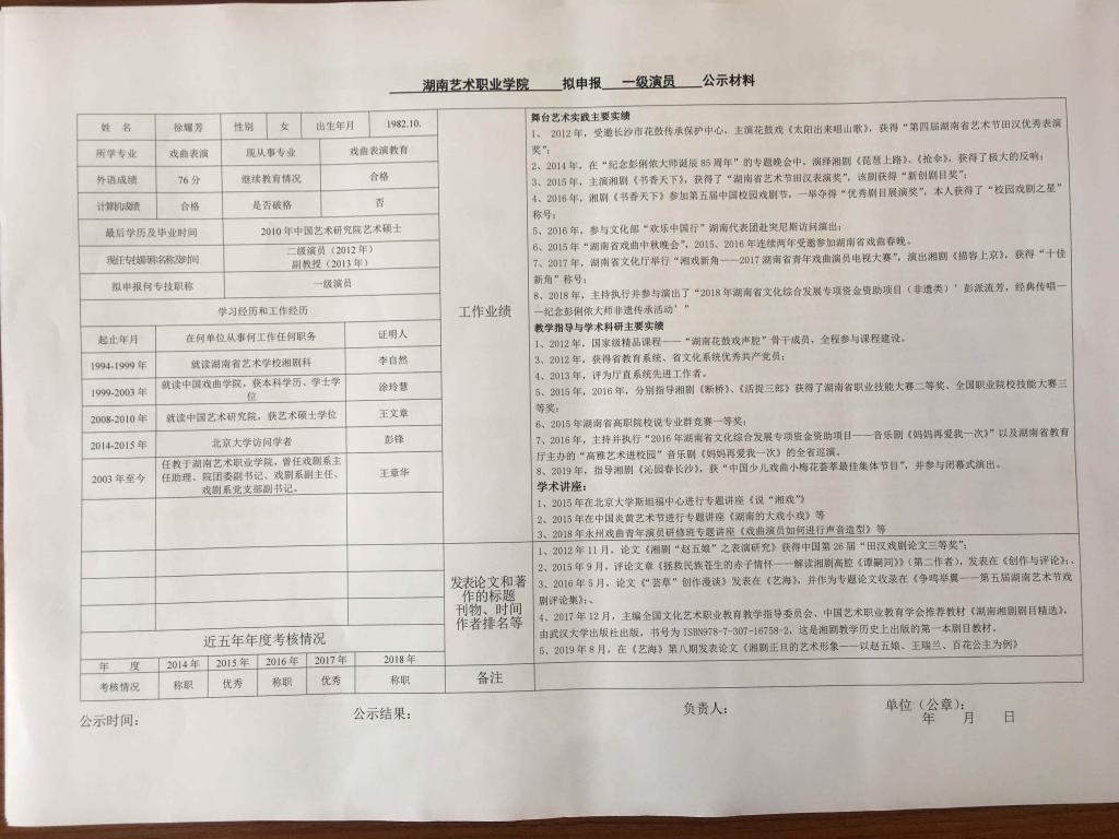 学院今年有34位同志申报艺术、图书资料、群众文化、政工系列职称,按湘文旅人【2019】84号《关于做好2019年度艺术、图书资料、群众文化、文物博物系类职称评审工作的通知》规定,现将以下同志的基本情况予以公示。公示人员名单见附件。