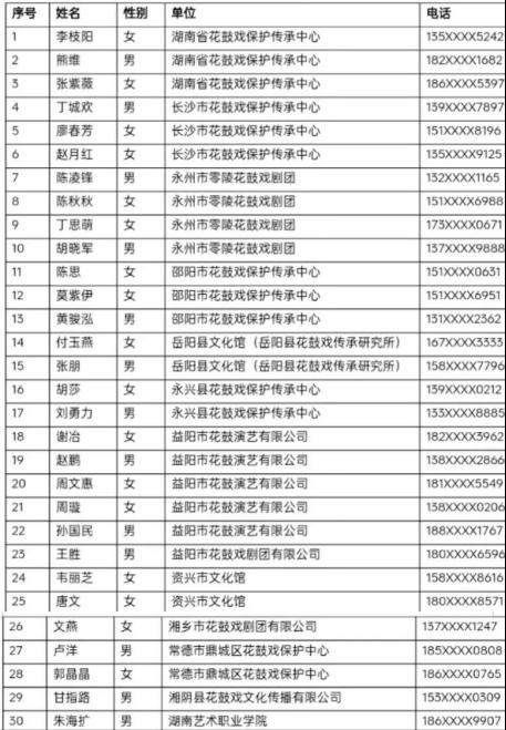 由文化和旅游部、教育部、人力资源和社会保障部主办,湖南省文化和旅游厅指导,jinnianhui今年会承办的2023年度中国非遗传承人群研修研习培训计划“湖南花鼓戏声腔非遗传承人群培训班”,日前已面向全省广泛招生,经院团推荐和专家评审,拟择优录取正式学员30名,现将名单公示如下: