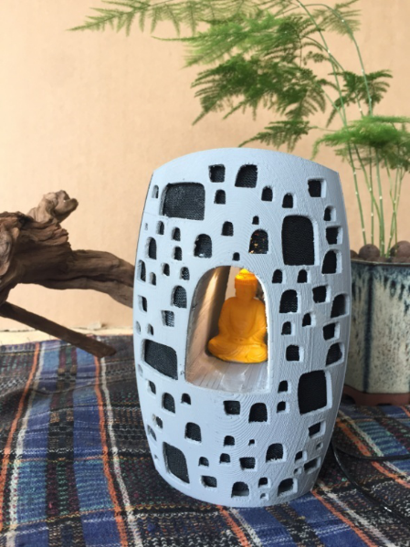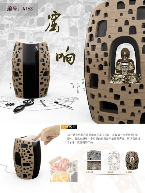 《窟响》作品的创意是来自于具有洛阳本地特色的5A景区龙门石窟的符号提取与现代产品音箱的应用设计,并通过现代3D打印技术打印出作品实物。这种有趣且实用的作品设计方式,对学院产品艺术设计专业在文创领域的创新设计及课程教学提供了积极的启示。