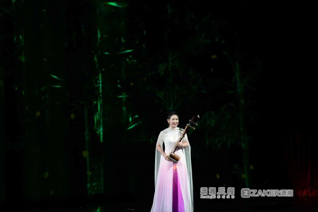 " 无大筒不花鼓,我要让每一个有长沙人的地方就有浏阳河!" 在第四篇章,湖南大筒传人蔡霞一袭华服登台,向现场观众展示湖南本土乐器大筒的魅力。大筒取材于竹,琴声刚柔快慢,包罗世间悲欢冷暖。" 我的爸爸曾是一名大筒乐手,妈妈是一名花鼓戏演员,大筒与花鼓戏的和鸣,是我童年最美好的记忆。"