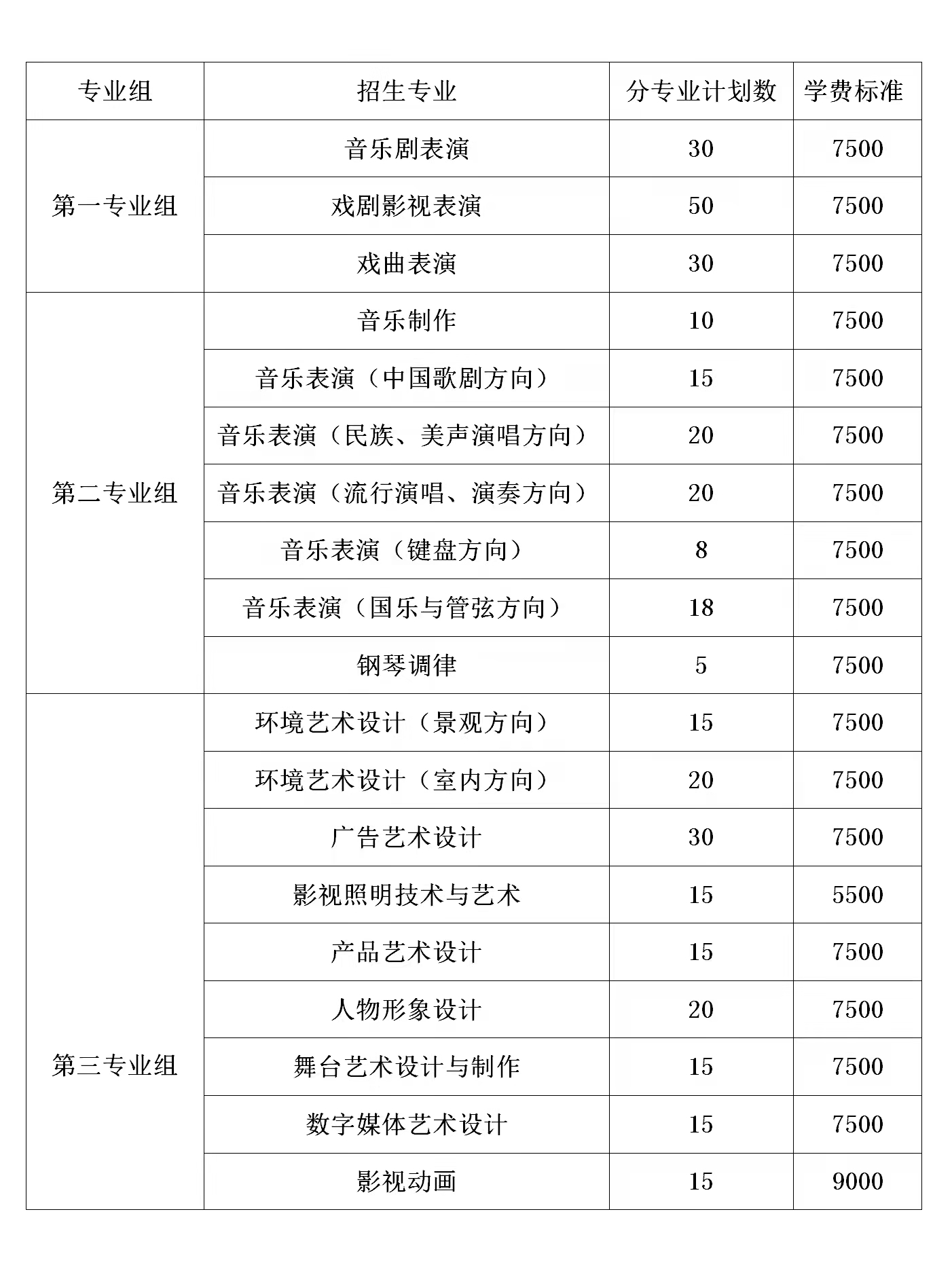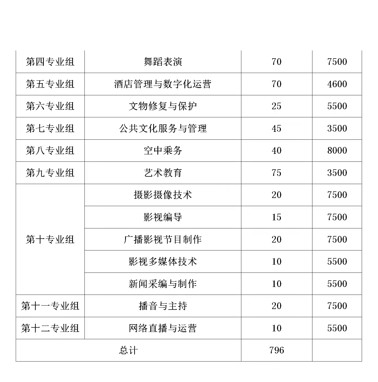 第十一条 我院2022年单招总计划为800人,具体单招专业组、计划和收费标准如下表。