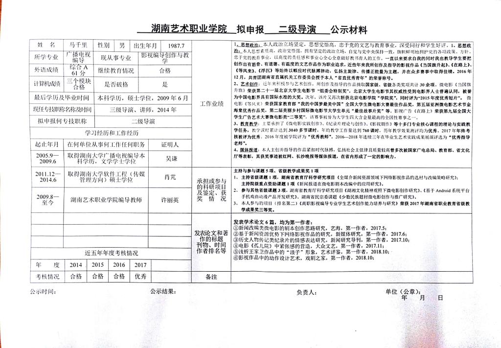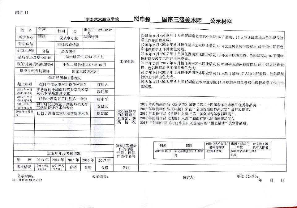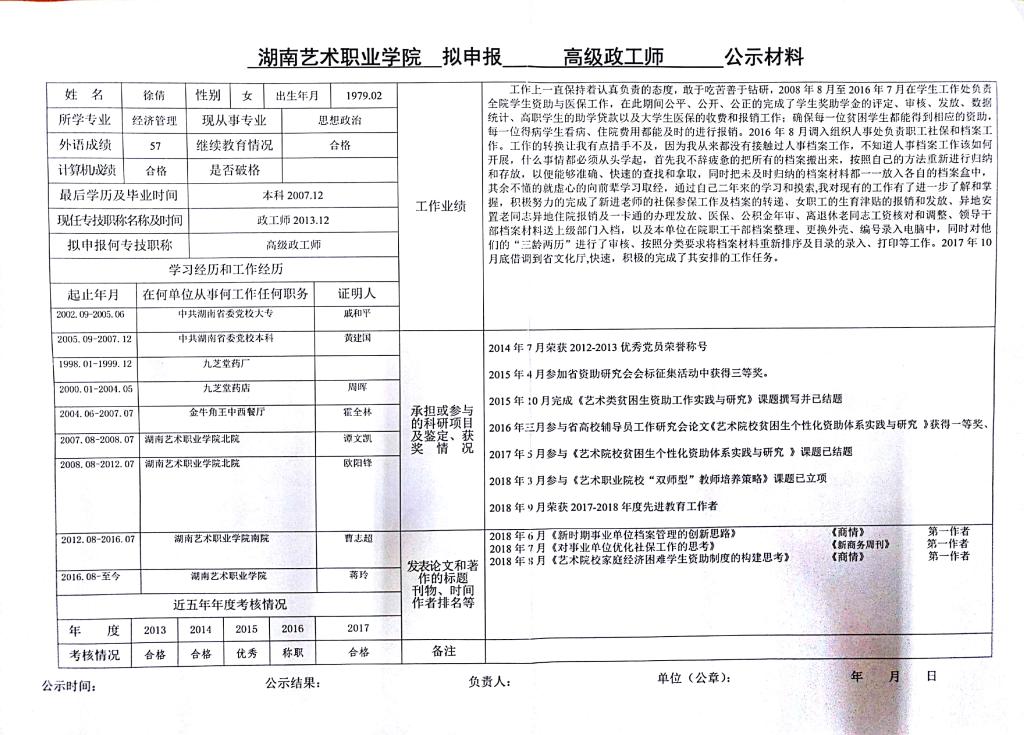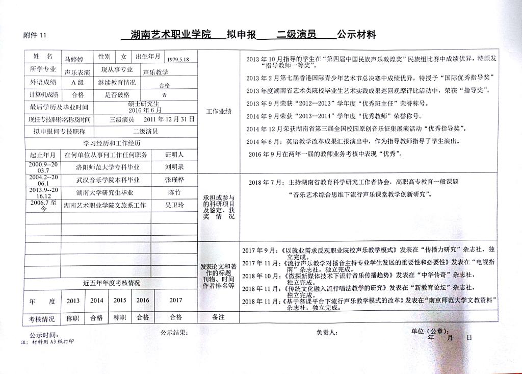 学院今年有24位同志申报艺术、群文、政工系列职称,按湘人社发【2018】51号《关于做好2018年度职称评审工作的通知》规定,现将以下同志的基本情况予以公示。