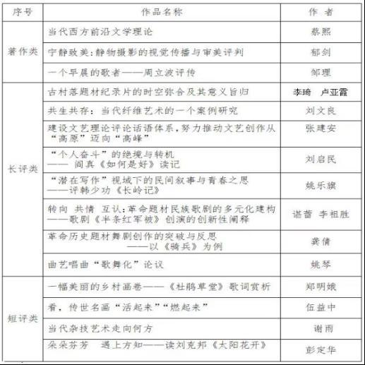 据悉,本届推优活动通过广泛发动、单位推荐或个人自荐,经资格审核、专家评审、纪检监督,在全省范围共评选出优秀文艺评论著作3部、优秀文艺评论文章8篇、优秀短评文章4篇。