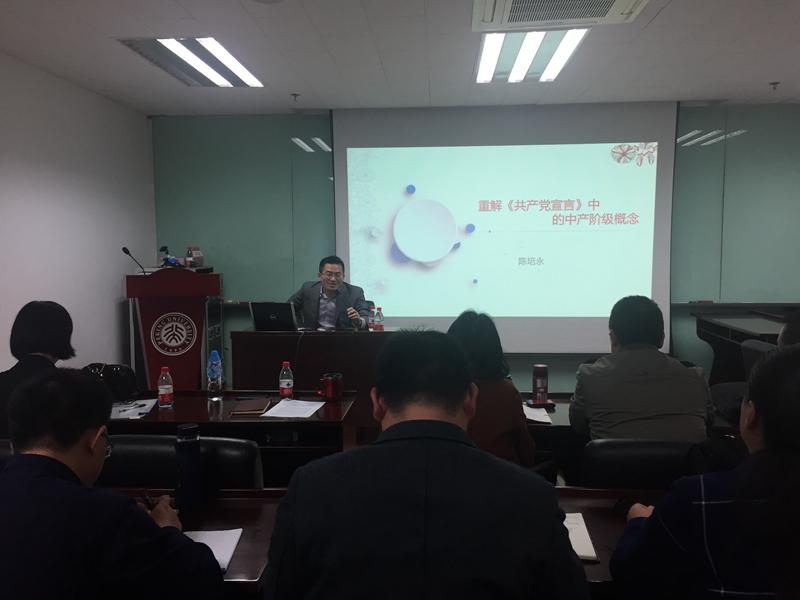 陈培永副教授以“重解《共产党宣言》中的‘中产阶级’概念”为题,展示了自己酝酿已久的研究成果。陈老师认为,中产阶级问题是考验马克思主义阶级理论在中国社会的“生命力”的问题,而“中产阶级”又是模糊的,这是没有阶级性的“阶级”,没有生产关系支撑的阶级,是特定社会成员分享的共同属性,字面看是“阶级”,而重要的是“中产”。在报告中,陈老师还就中产阶级、资产阶级、无产阶级的流动关系进行了探讨。